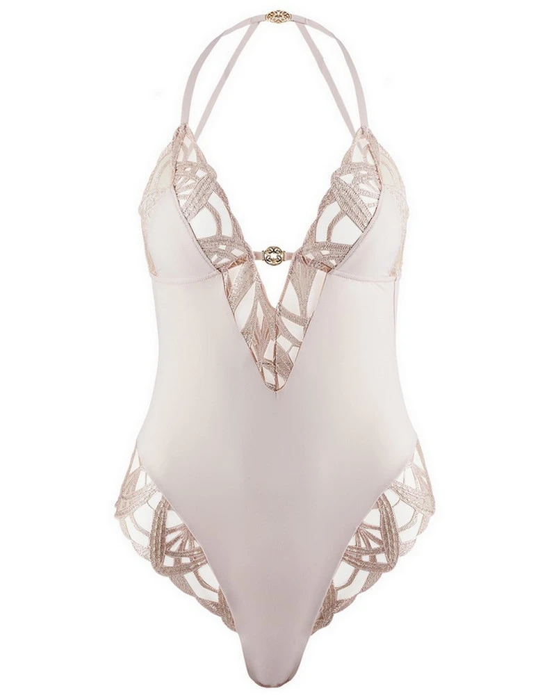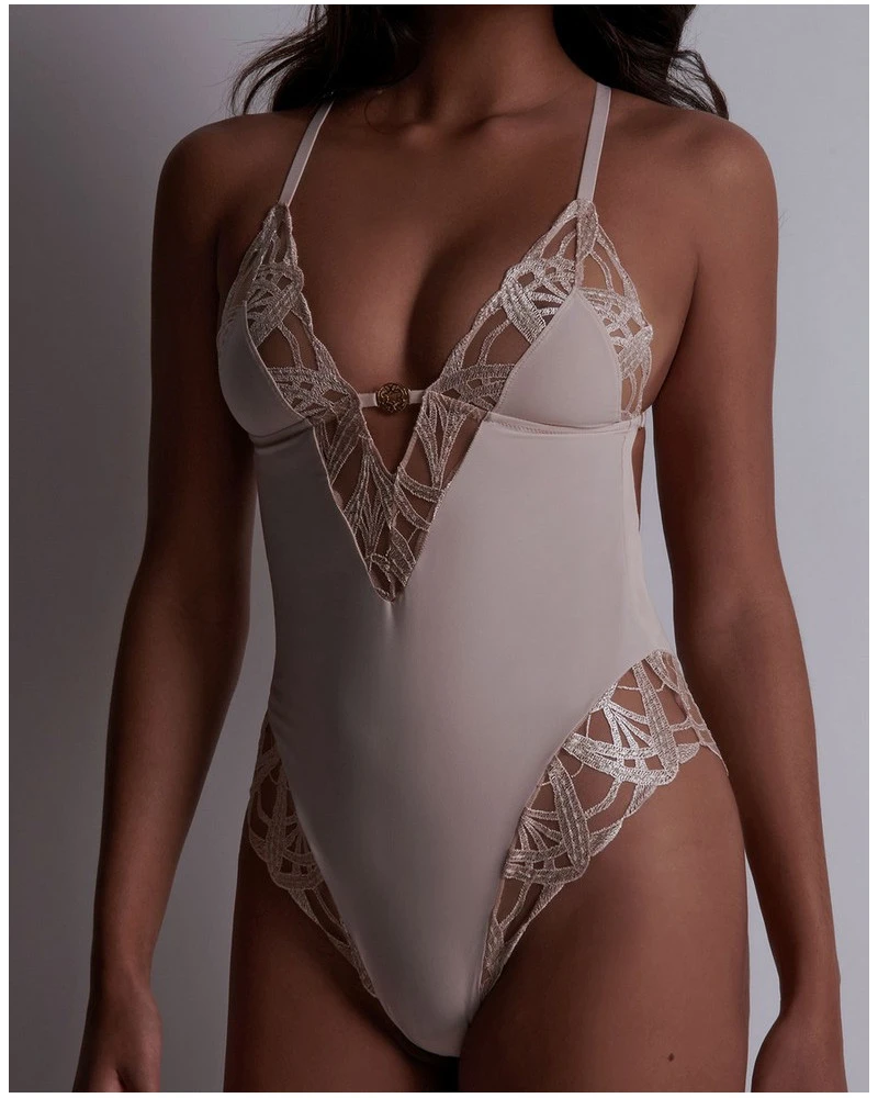 Le body de la collection My Desire vous offre un aspect sensuel et Ă©lĂ©gant de parts son dĂ©coltĂ© plongeant et son dos nu ainsi qu’Ă ses matĂ©riaux de qualitĂ© jouant sur la transparence des matières, le tout ornĂ© d’un bijou Ă l’entre gorge siglĂ© Elie Saab.