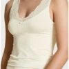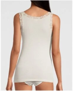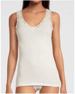Un dĂ©bardeur laine & soie fabriquĂ© en Italie au dĂ©colletĂ© ornĂ© d’une dĂ©licate dentelle Leavers pour un confort optimal et une esthĂ©tique raffinĂ©e.