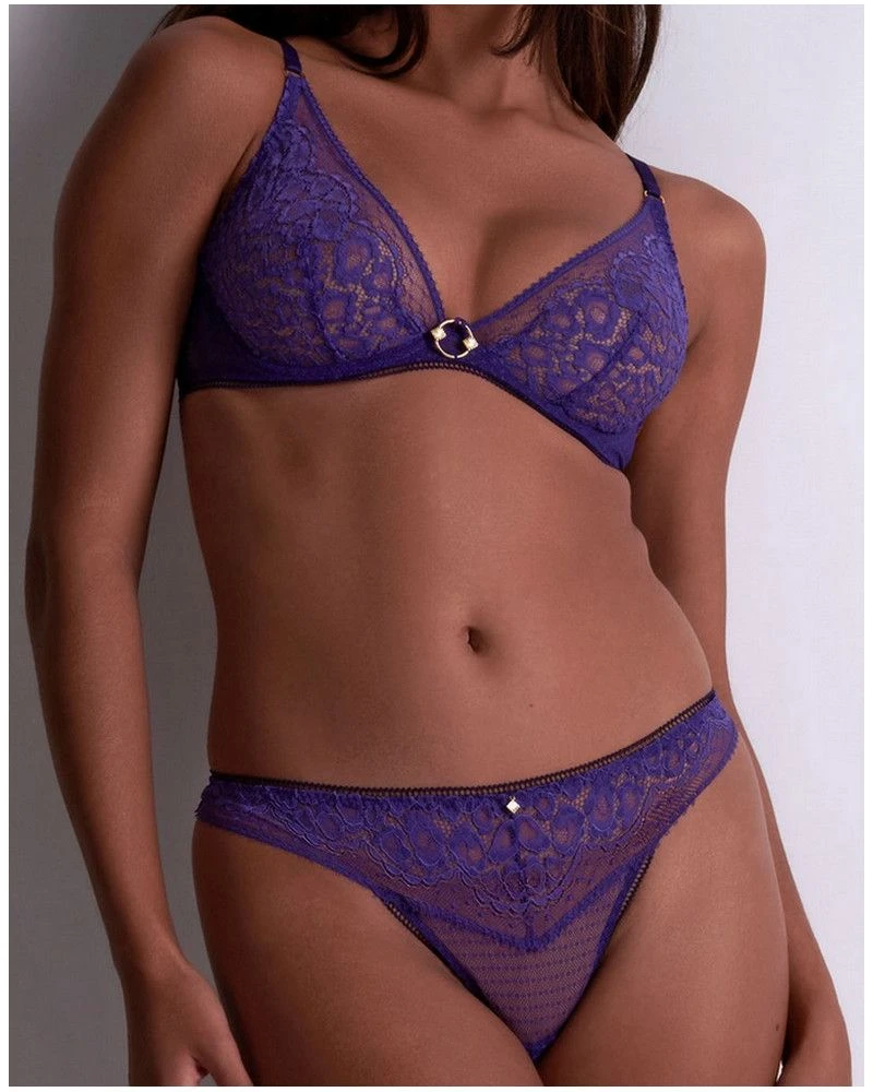 Le soutien-gorge triangle de la collection Illusion Fauve assure un look sexy et moderne de par sa coupe et son dĂ©colletĂ© plongeant, le tout sublimĂ© par un bijou Ă l’entre-gorge.
