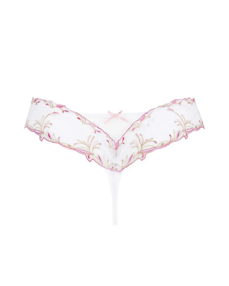 Le string Lise Charmel Été Frivole met en valeur le galbe des fesses et dessine sur la peau un motif floral.