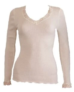 Un top Ă manches longues laine & soie fabriquĂ© en Italie au dĂ©colletĂ© ornĂ© d’une dĂ©licate dentelle Leavers pour un confort optimal et une esthĂ©tique raffinĂ©e.